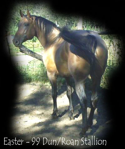 Shown above is a 1999 DUN/ROAN stallion, no white markings, sired by Jaks Gold King Leo and out of an own daughter of BENITO BAR MARK, AQHA Champion. "Easter" is FOR SALE. |